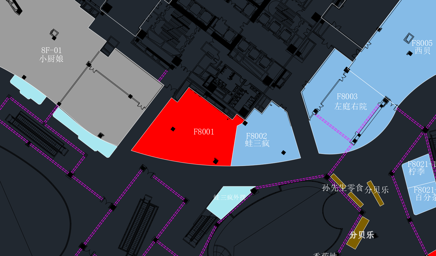 位于餐饮核心楼层,紧邻”小厨娘“和”蛙三疯“,正对”南京大排档“